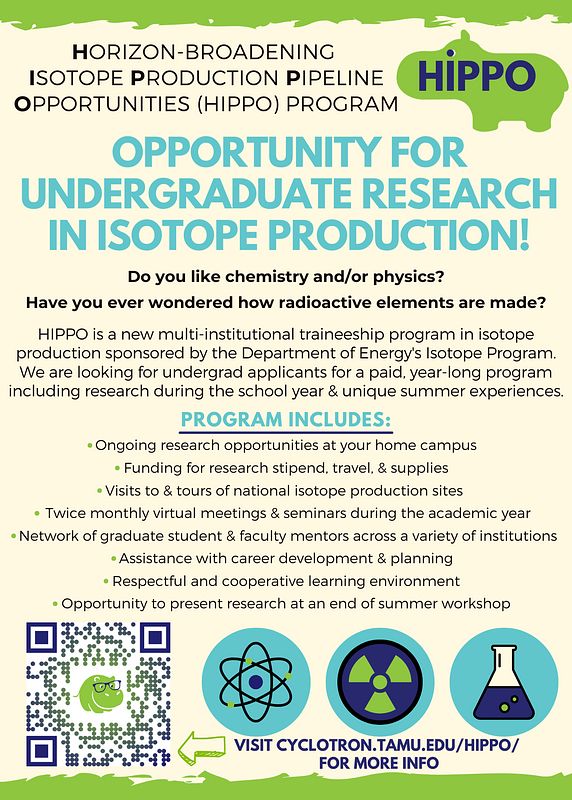 A new and exciting research opportunity for both undergraduate and graduate students is available through the Horizon-broadening Isotope Production Pipeline Opportunities (HIPPO) program. This is a brand new collaboration offering year-long paid research and networking opportunities in isotope production and radiochemistry. I am looking for an undergraduate student to join my lab and participate in this program. Apply Here